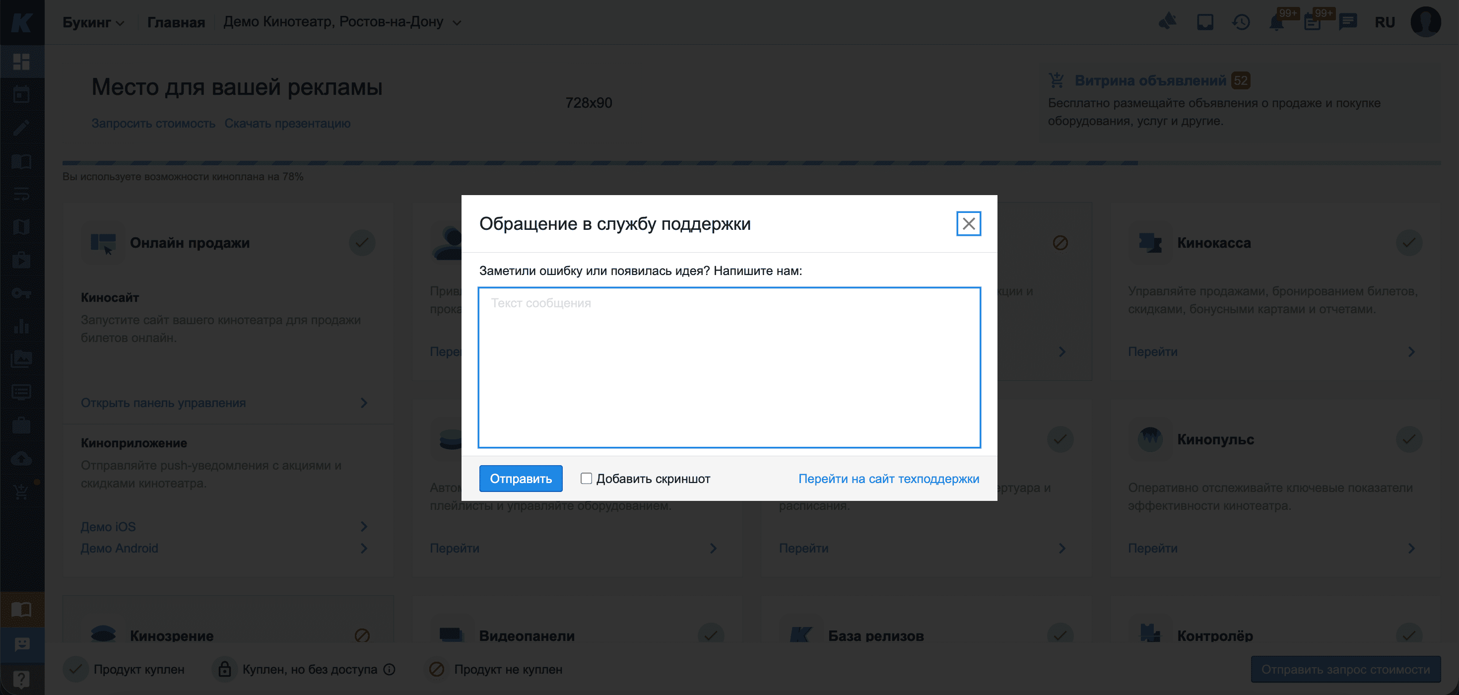 Вы попадаете на главную страницу технической поддержки. Здесь вы сможете составить заявку, следить за статусом заявки, добавить комментарий и посмотреть историю обращений.