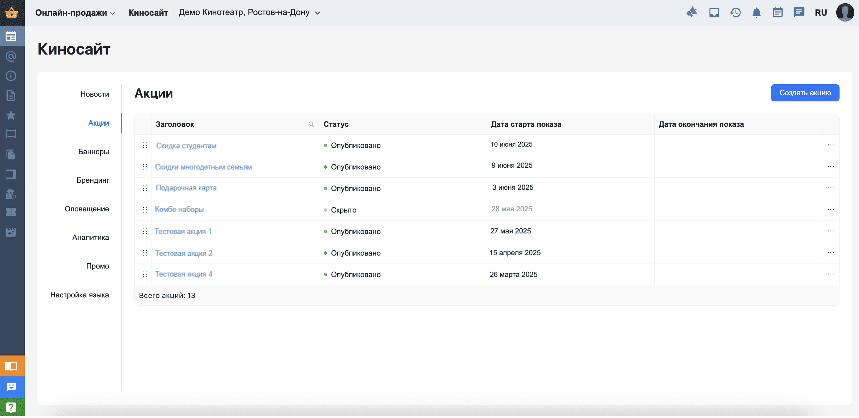 Скрытые акции помечены в списке серым кружочком и не показываются на сайте кинотеатра. Чтобы сделать их активными, нажмите Опубликовать.