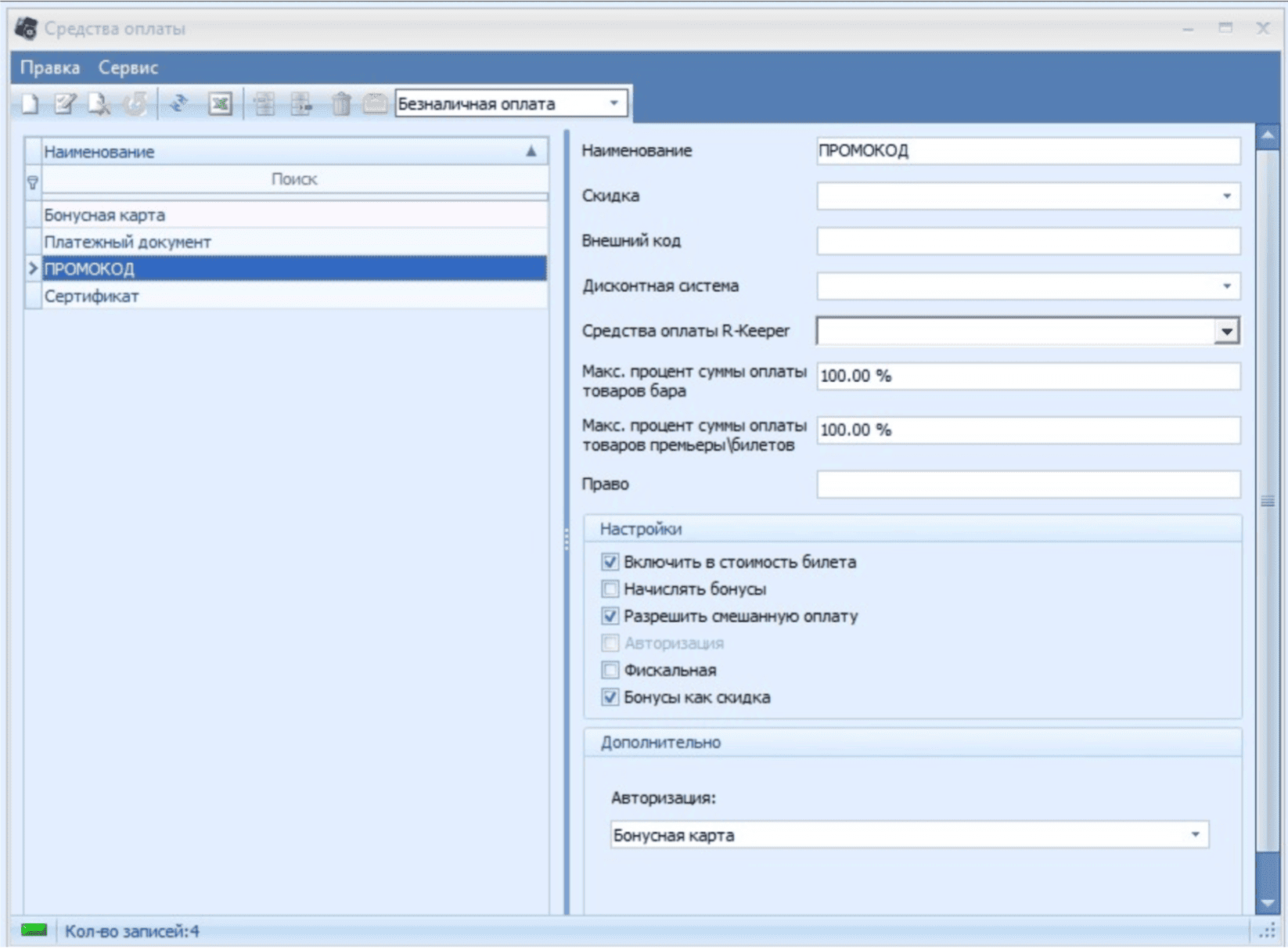 Менеджерская → Объекты учета → Средства оплаты → в выпадающем списке выбрать Безналичная оплата → Создать новое средство оплаты ПРОМОКОД.