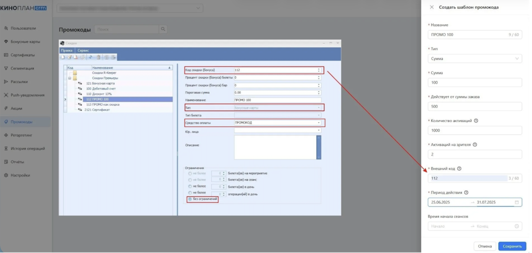 Например: в Премьере будет настроен один шаблон ПРОМО с внешним кодом 112, а на стороне CRM можно создавать неограниченное количество шаблонов с промокодами, различными условиями, суммами и периодами и связать их с одним и тем же Кодом скидки (бонуса). Валидация применения промокода будет проходить на стороне CRM.