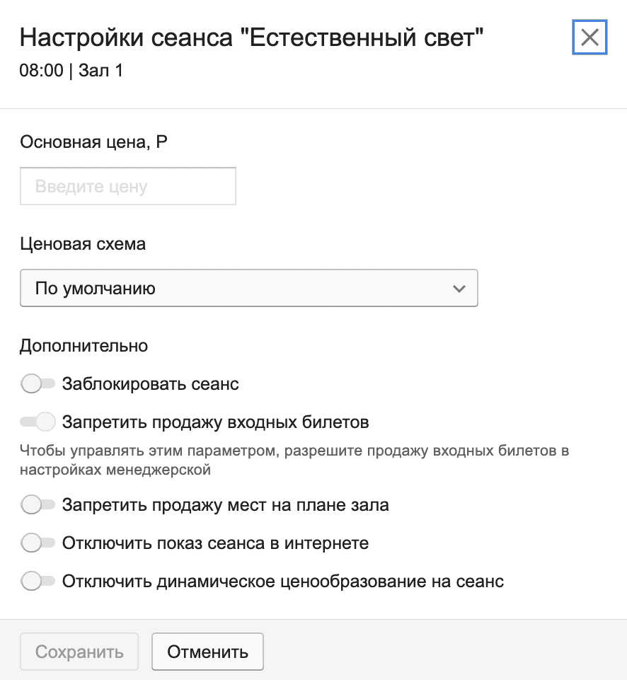 В окне Настройки сеанса возможно выбрать ценовую схему для релиза и задать настройки для продажи билетов.