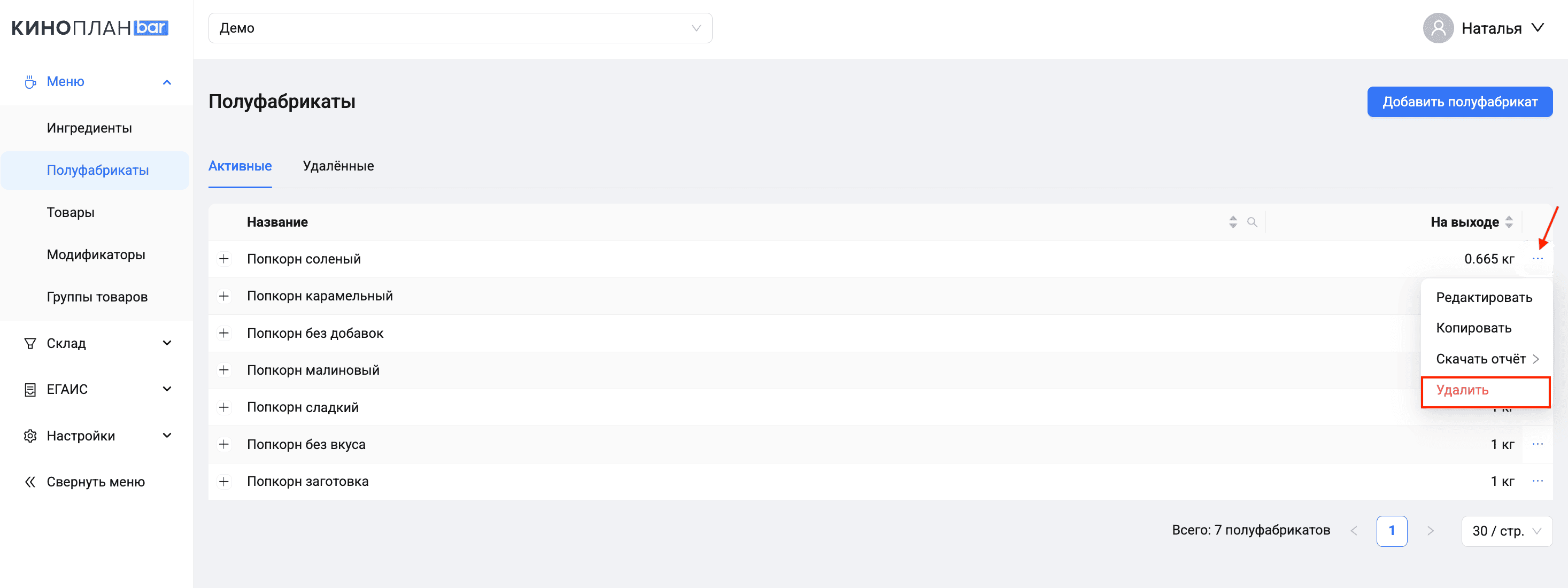 Нажмите Удалить в строке полуфабриката или в окне редактирования. Система переместит полуфабрикат на вкладку Удаленные.