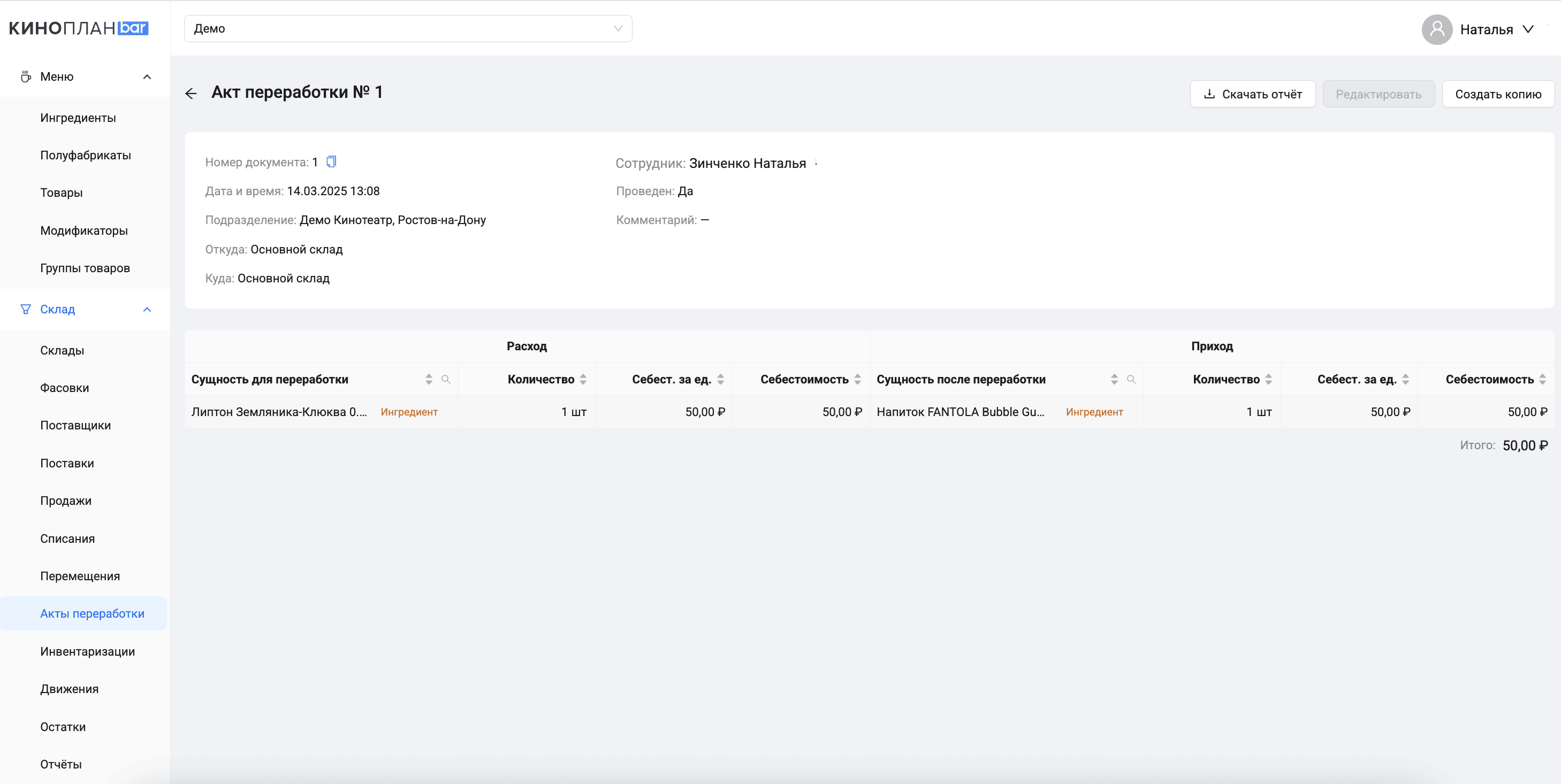 Чтобы после изменения состава и количества ингредиентов для акта переработки появились остатки и актуальная себестоимость, нажмите кнопку Обновить себестоимость и остатки.