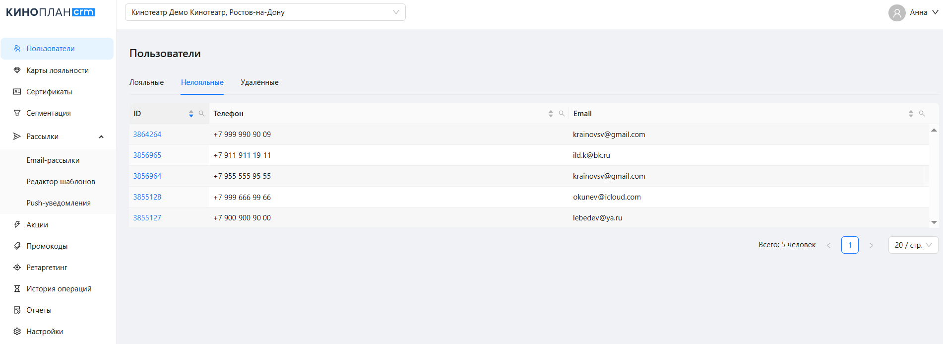 Если переключатель активен, то в разделе Пользователи отображается вкладка «Нелояльные» с контактной информацией незарегистрированных в системе зрителей, а также данные об их заказах.