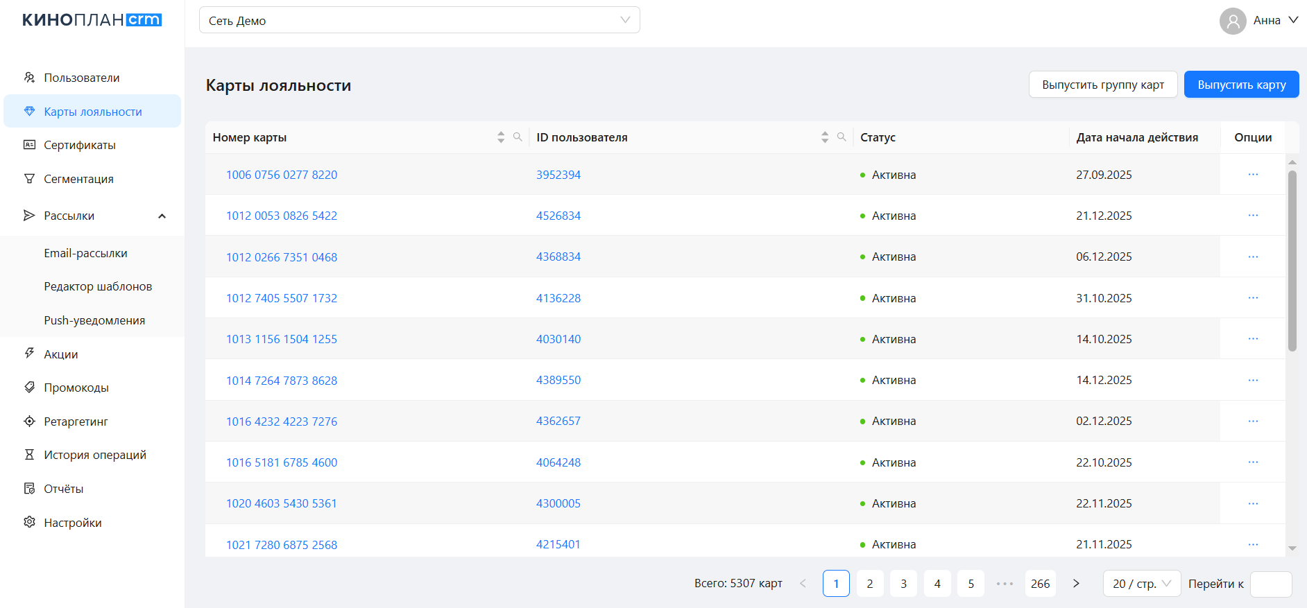 В разделе отображаются все карты лояльности, созданные в данной системе или импортированные из других систем.