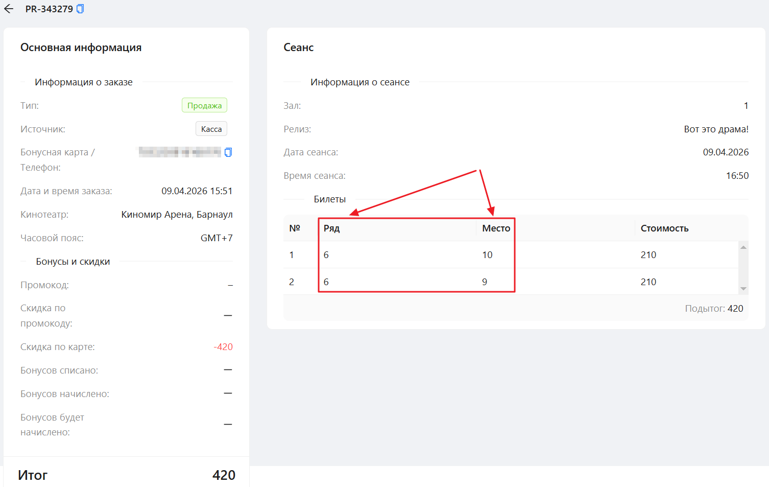Номер места и ряда в билете нелояльного зрителя передаётся в Киноплан.CRM из Онлайн-продаж.