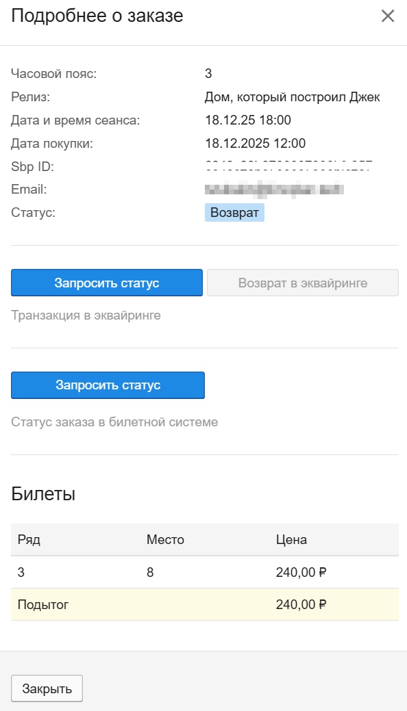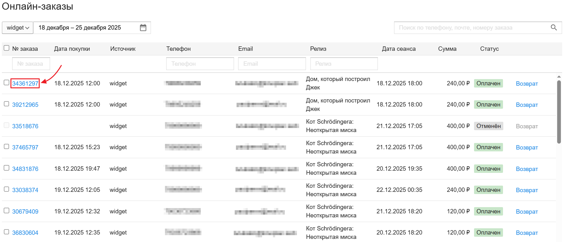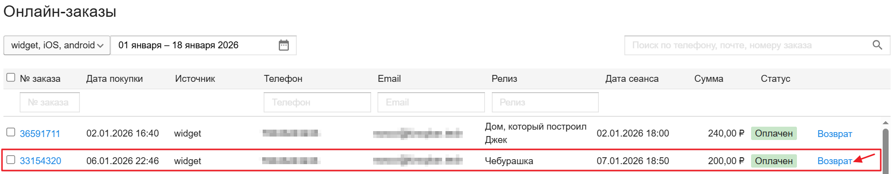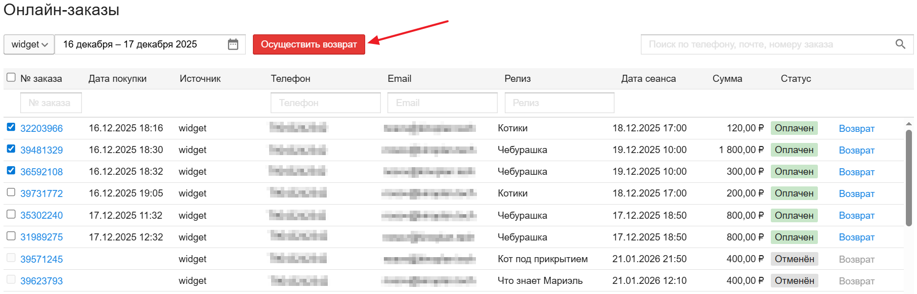 Возврат через раздел «Онлайн-заказы» изменит статус заказа в разделе и билетной системе.
