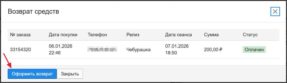 Возврат раздел «Онлайн-заказы» изменит статус заказа в разделе. Возврат денег выполняет кинотеатр через личный кабинет банка. Билеты необходимо вернуть в билетной системе в приложении «Касса» (для корректировки отчётов).