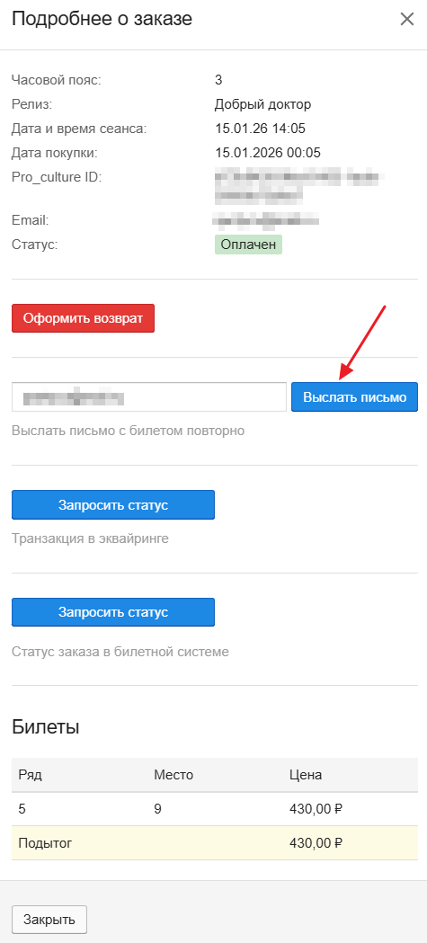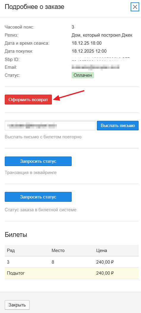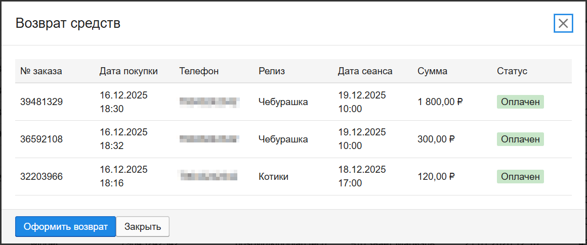 Возврат через раздел «Онлайн-заказы» произведёт возврат денег, изменит статус заказа в разделе и билетной системе.