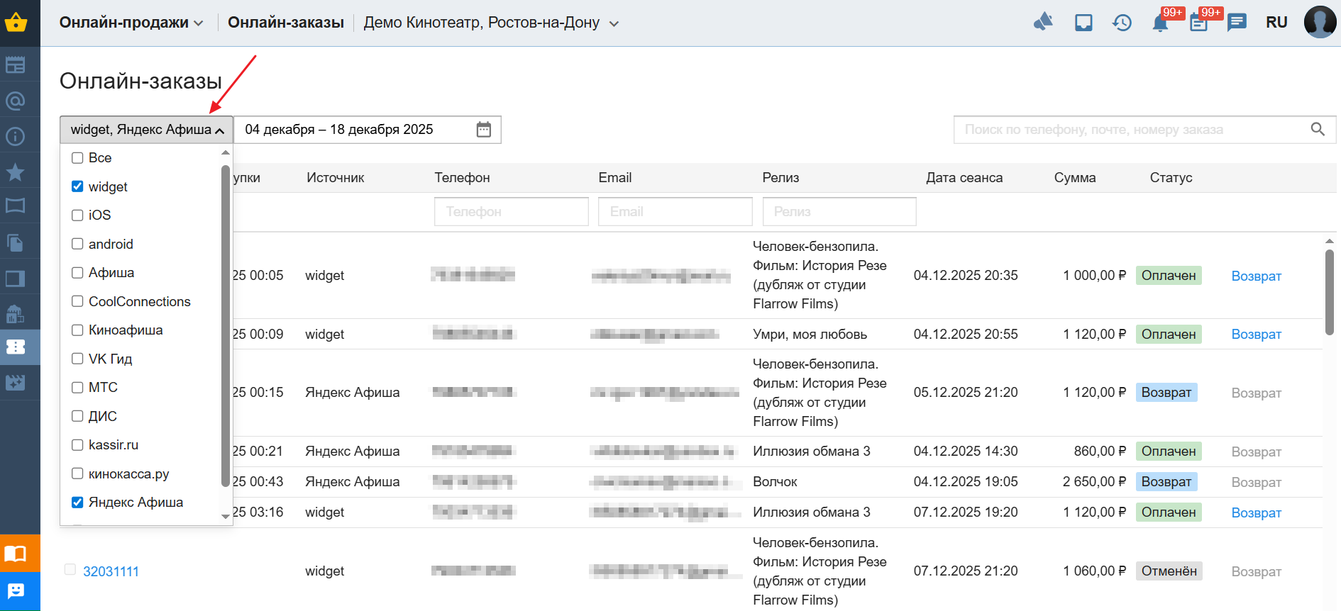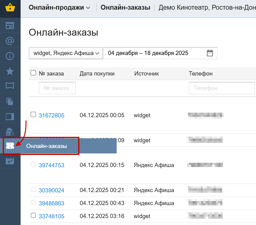В Киноплане в Онлайн-продажах перейдите в раздел «Онлайн-заказы».