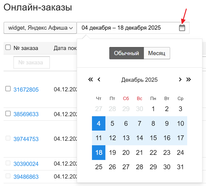 В календаре задайте период, за который необходимо просмотреть заказы: