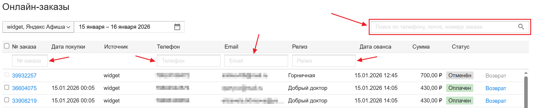 Поля поиска размещены в столбцах № заказа, Телефон, Email и Релиз соответственно.