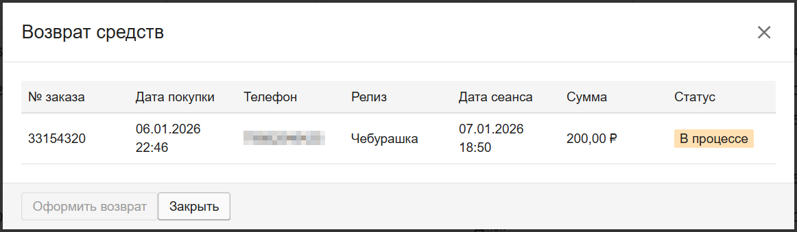 Возврат через раздел «Онлайн-заказы» изменит статус заказа в разделе. Возврат денег осуществляет кинотеатр через личный кабинет банка. Возврат билетов производится на кассе.