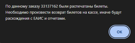 Возврат через раздел «Онлайн-заказы» только изменит статус заказа в разделе. Появится уведомление о необходимости вернуть билеты в билетной системе в приложении «Касса» (для корректировки отчётов).