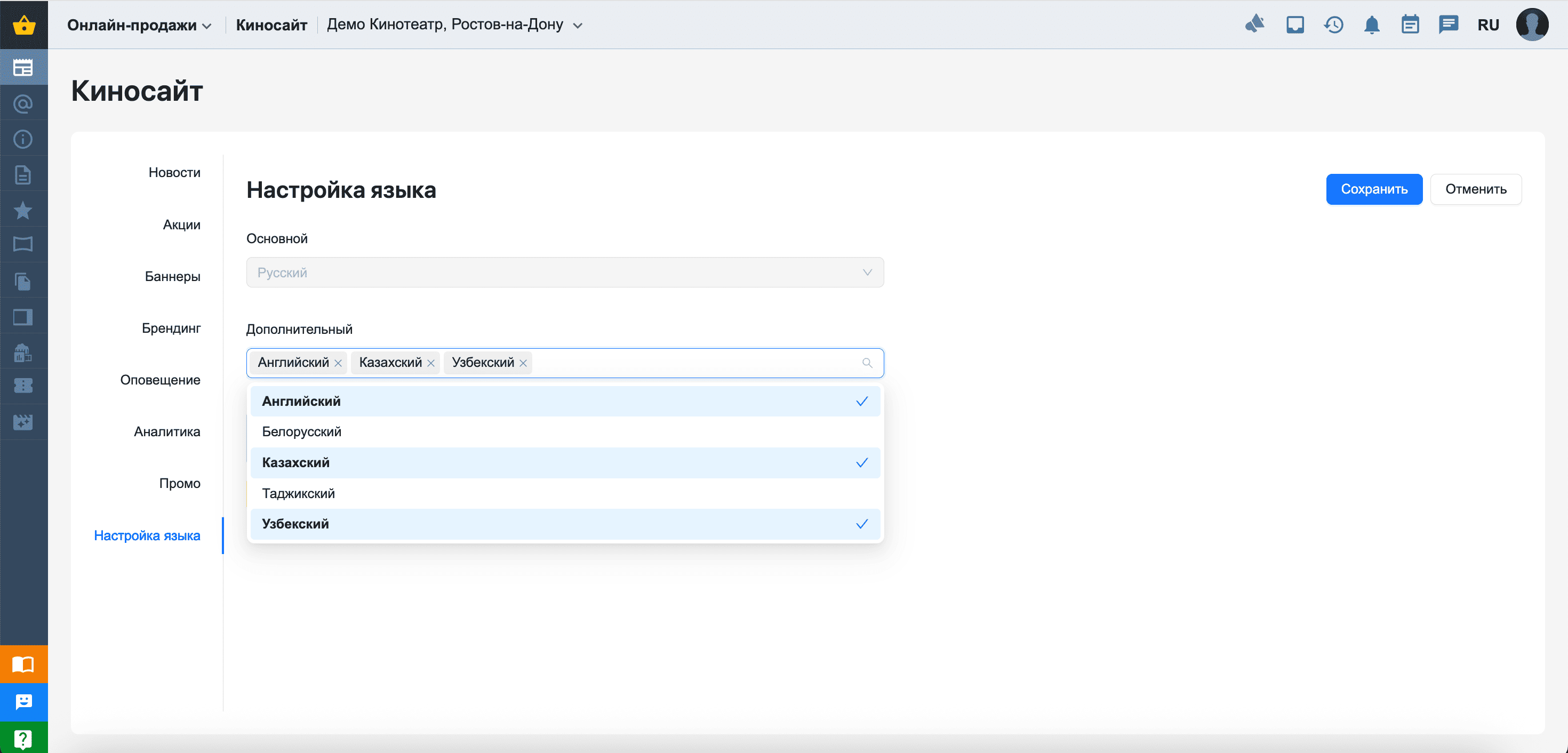 Во вкладке Настройка языка можно выбрать один или несколько дополнительных языков. Эти языки будут отображаться в виде дополнительных языковых настроек в разделах Новости, Акции, Баннеры и Информация о кинотеатре.