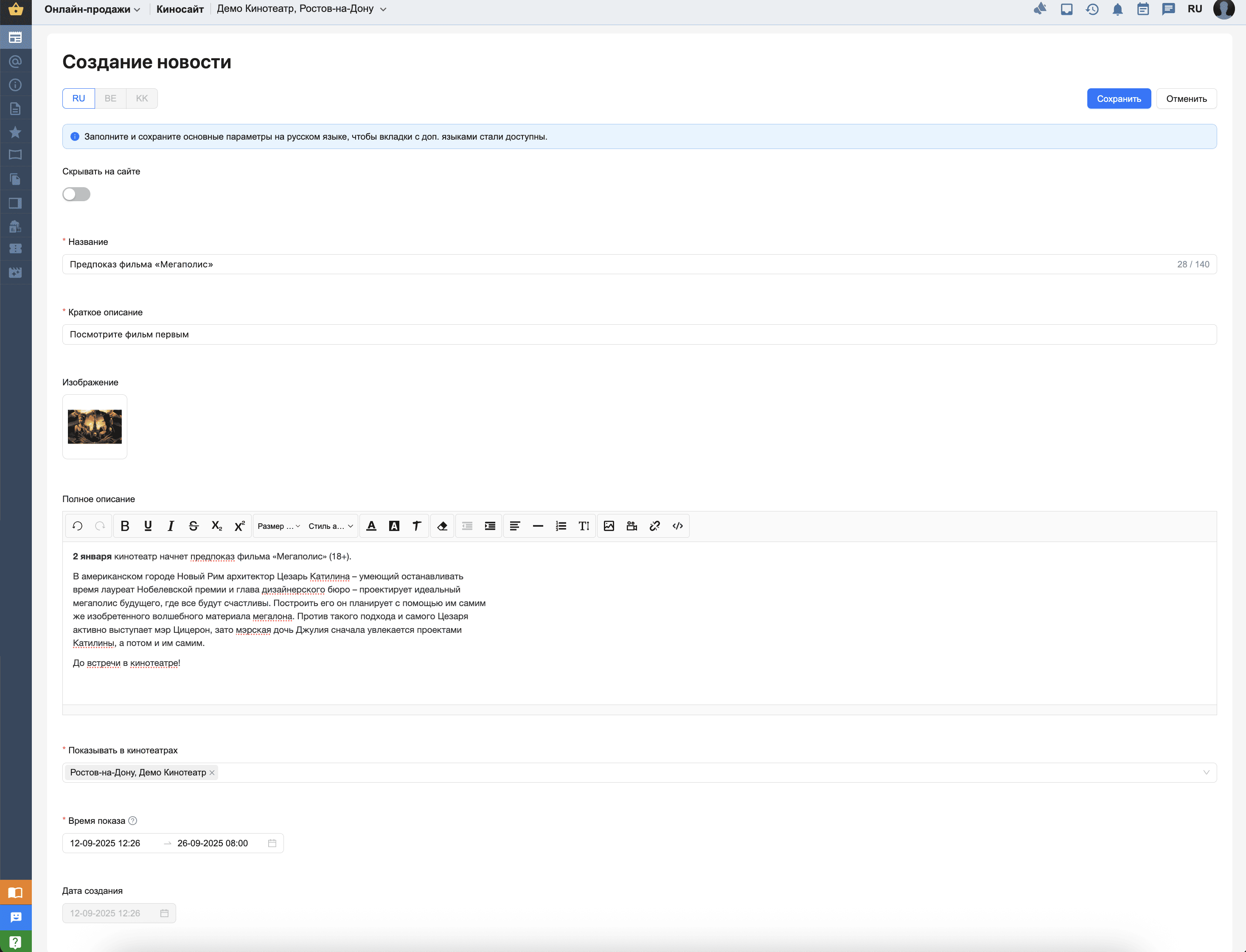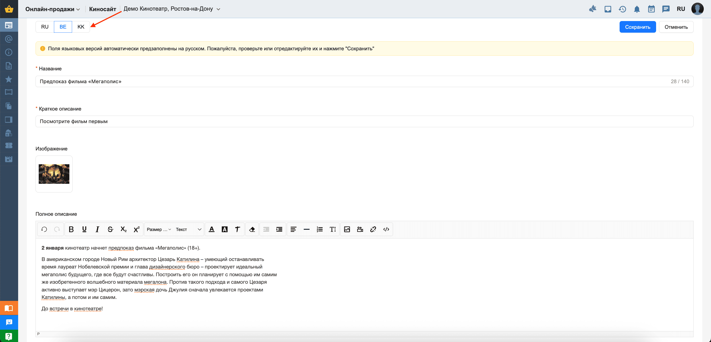 После сохранения новости на основном языке станут доступны вкладки для введения информации на дополнительных языках, предварительно выбранных в настройках.