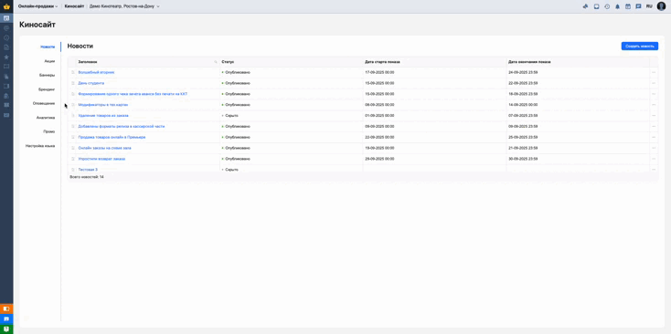 Во вкладке Новости можно управлять новостями на сайте кинотеатра. Публикуйте информацию о предстоящих событиях и акциях, фотоотчеты с прошедших мероприятий.