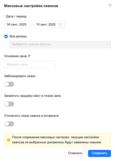 Функция массовых настроек сеансов позволяет задать и применить настройки не только к одному сеансу, но и к нескольким сеансам, на определенную дату или период.